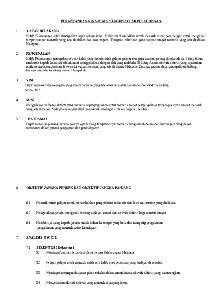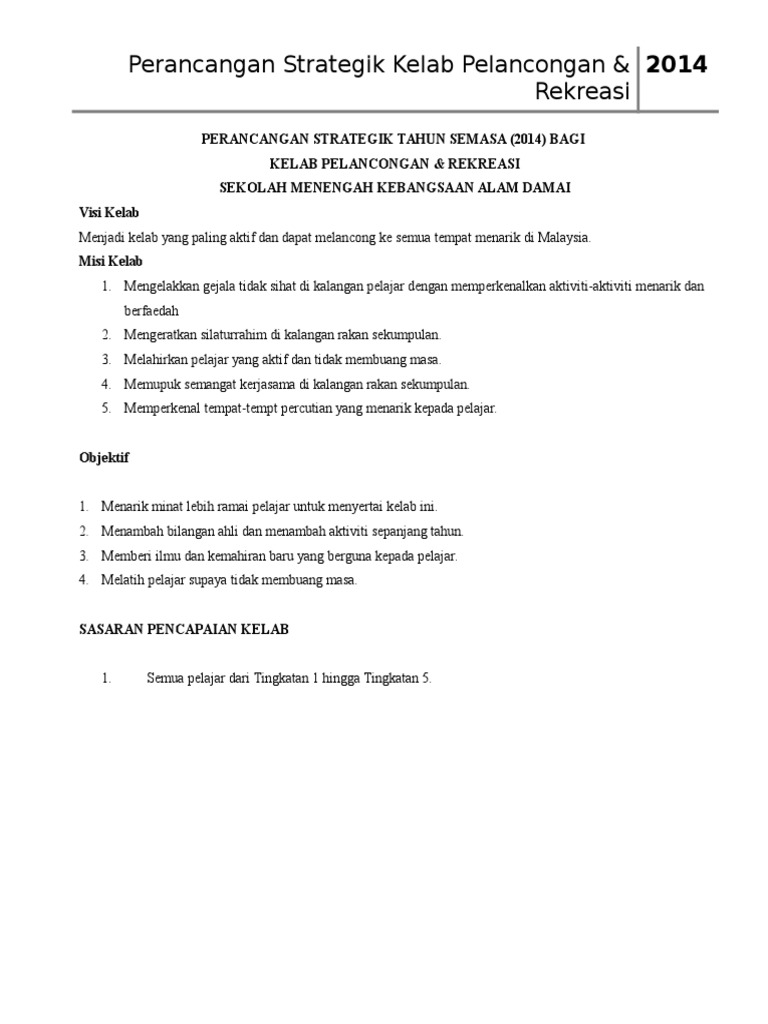 Doc Perancangan Strategik Tahun Semasa 2017 Bagi Kelab Pencinta Alam Pelancongan Saonah Zabali Academia Edu